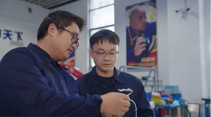 他以车间为家,每天焊接数百个焊点、绑扎上千个“丁香结”,用“记错题本”的方式总结经验,不断打磨技术。为了掌握先进工艺流程,他主动“拖班”学习,向老师傅虚心请教,甚至在转正前就提前达到上岗水平。袖口磨出的毛边、操作台上密密麻麻的刻痕,都见证了他从“新手”到“技术尖兵”的蜕变。